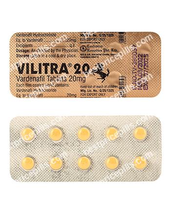 Vilitra is an oral drug used to treat erectile dysfunction. Sexual stimulation causes the production and release of nitric oxide from the nerves endings of the cavernous bodies of the penis hereby activating enzyme guanylate cyclase. Guanylate cyclase in its turn is responsible for production of cyclic guanosine monophosphate (cGMP). The cGMP causes widening and relaxation of the blood vessels carrying blood to the penis. Vilitra prevents phosphodiesterase-5 enzyme from destroying cGMP and thus helps to support blood flow to the penis.